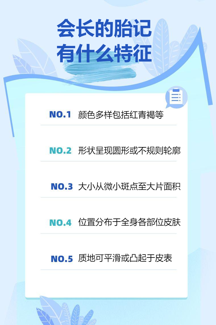 会长的胎记特征包括颜色、形状、大小、位置、质地等。