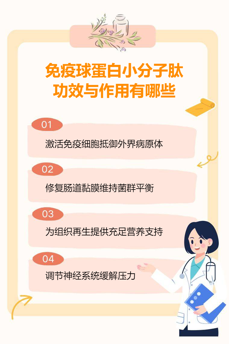 免疫球蛋白小分子肽具有增强免疫力、调节肠道功能、促进伤口愈合、改善睡眠质量等功效与作用。