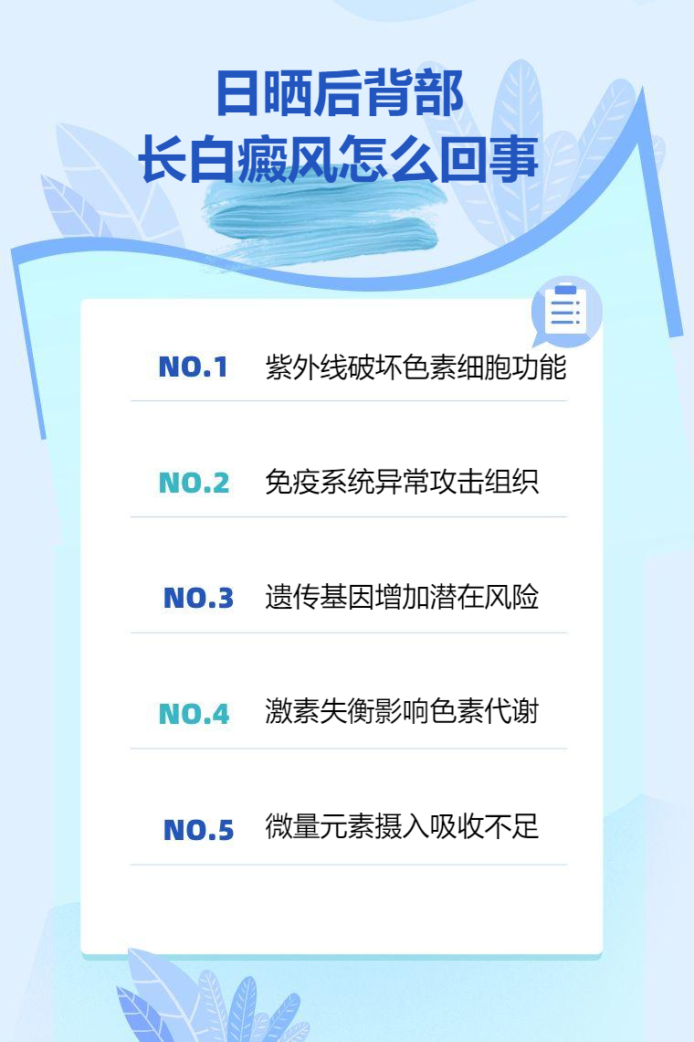 1. 黑色素细胞受损:强烈的日晒会使皮肤接受过量紫外线照射,紫外线可破坏黑色素细胞的结构和功能,导致其无法正常合成黑色素,进而在背部出现白斑,引发白癜风。