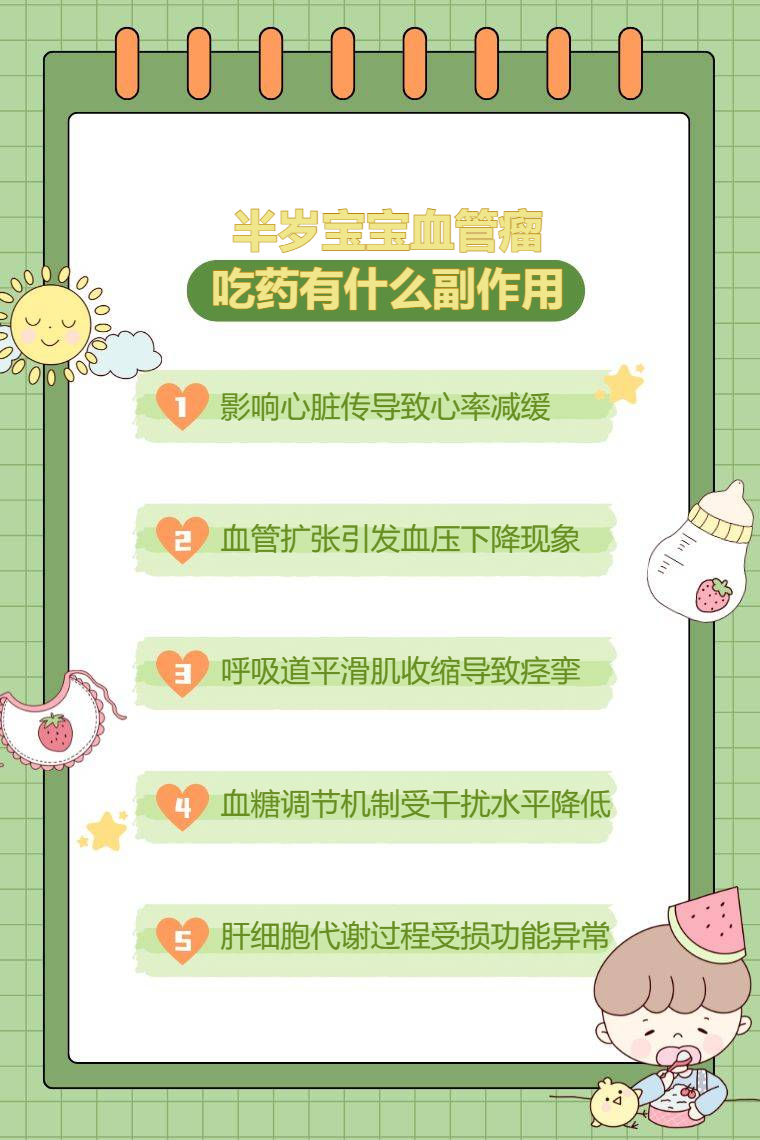 半岁宝宝服用治疗血管瘤的药物可能出现心率减慢、低血压、支气管痉挛、低血糖、肝功能损害等副作用。