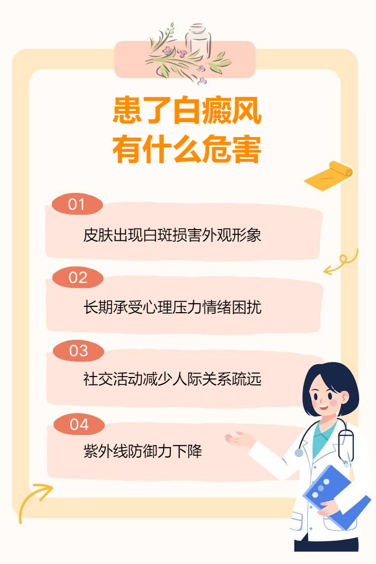 白癜风的危害包括皮肤损害、心理影响、社交障碍、引发其他疾病等。