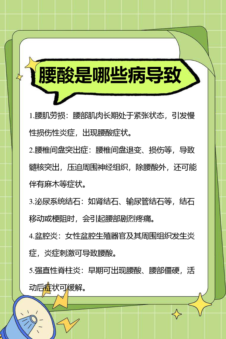 腰酸可能由腰肌劳损、腰椎间盘突出症、泌尿系统结石、盆腔炎、强直性脊柱炎等导致。