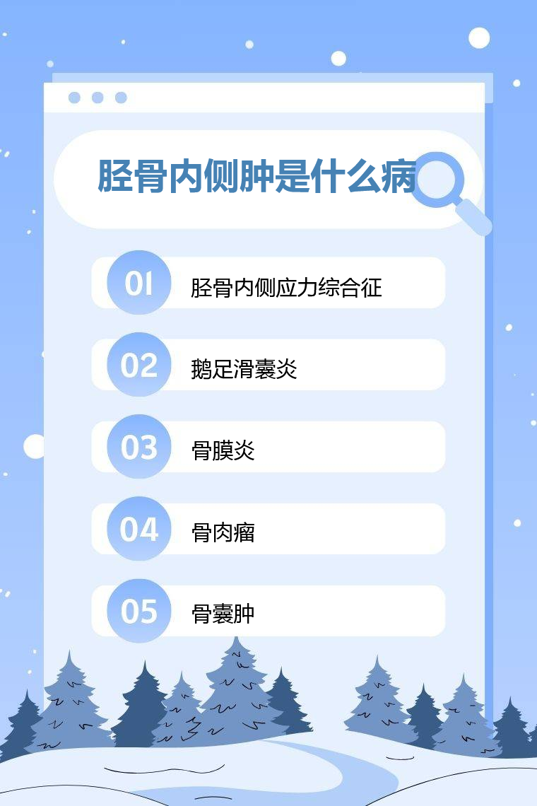 胫骨内侧肿可能是胫骨内侧应力综合征、鹅足滑囊炎、骨膜炎、骨肉瘤、骨囊肿等。