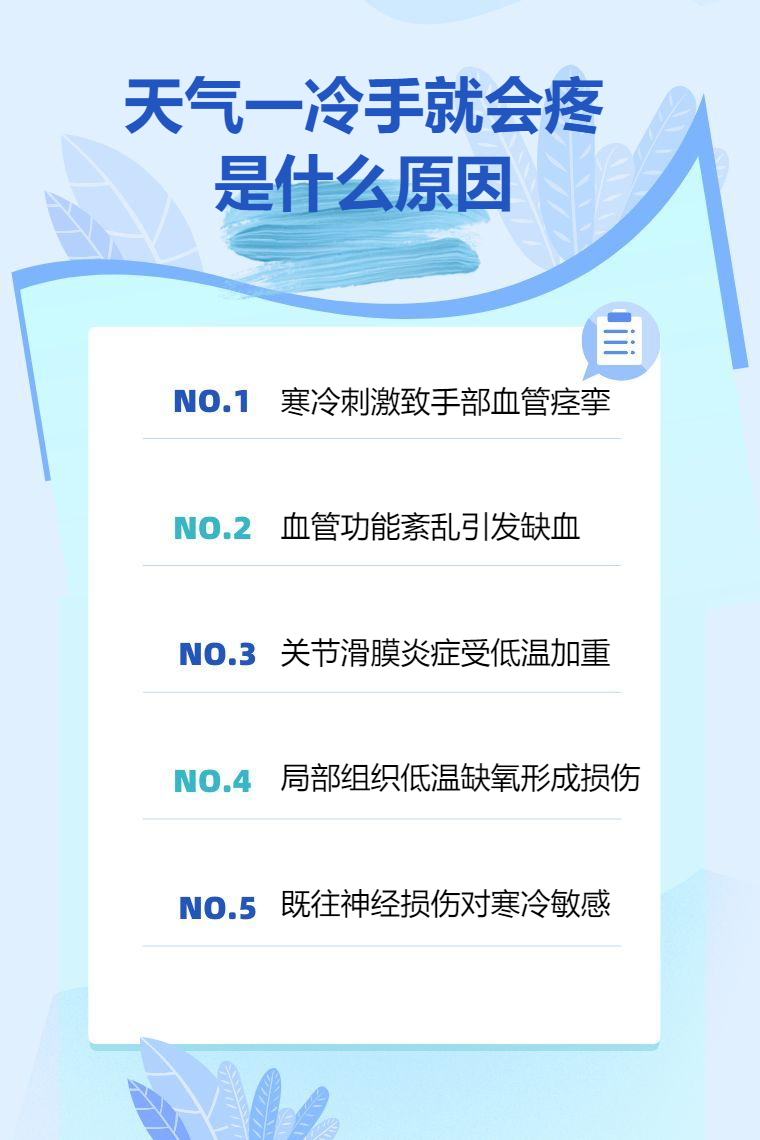 5. 神经损伤:曾经手部神经受伤,在寒冷刺激下,神经功能受影响,引发疼痛。可通过物理治疗如按摩、针灸等促进神经恢复,必要时遵医嘱用药。