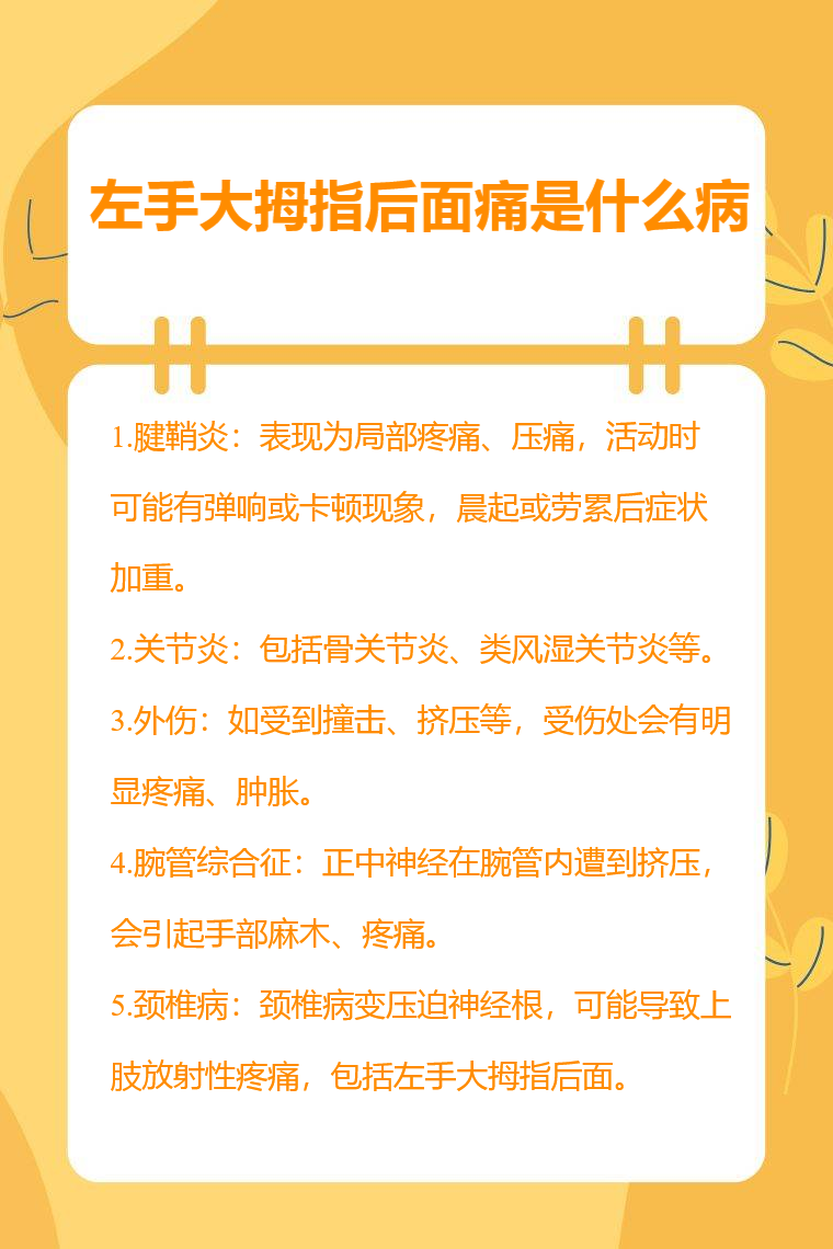 左手大拇指后面痛可能由腱鞘炎、关节炎、外伤、腕管综合征、颈椎病等引起。