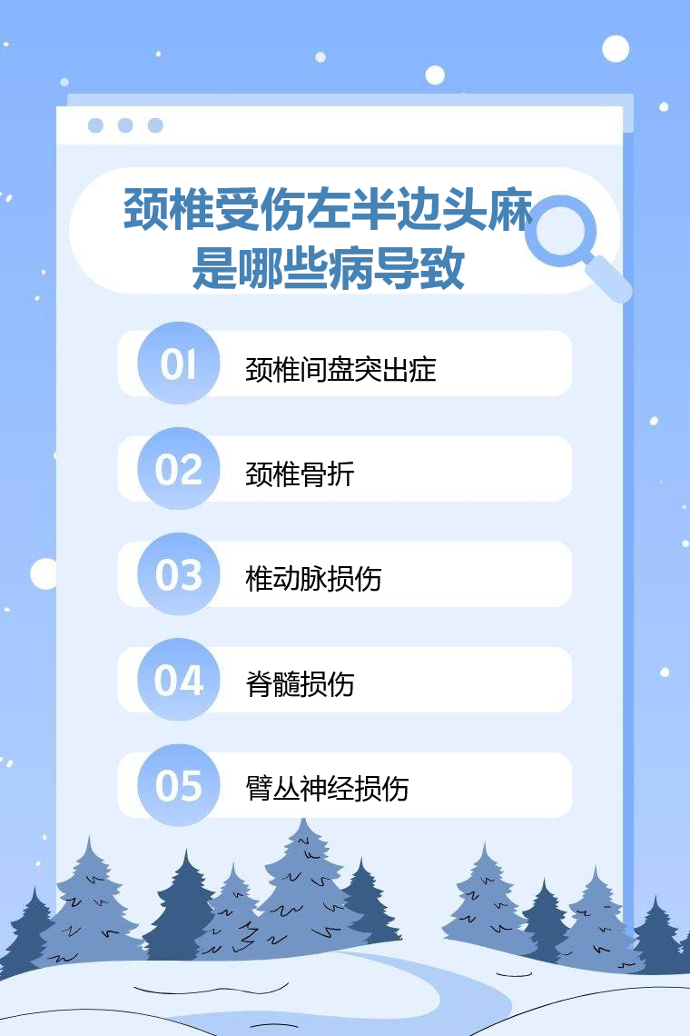 颈椎受伤后左半边头麻可能由颈椎间盘突出症、颈椎骨折、椎动脉损伤、脊髓损伤、臂丛神经损伤等导致。