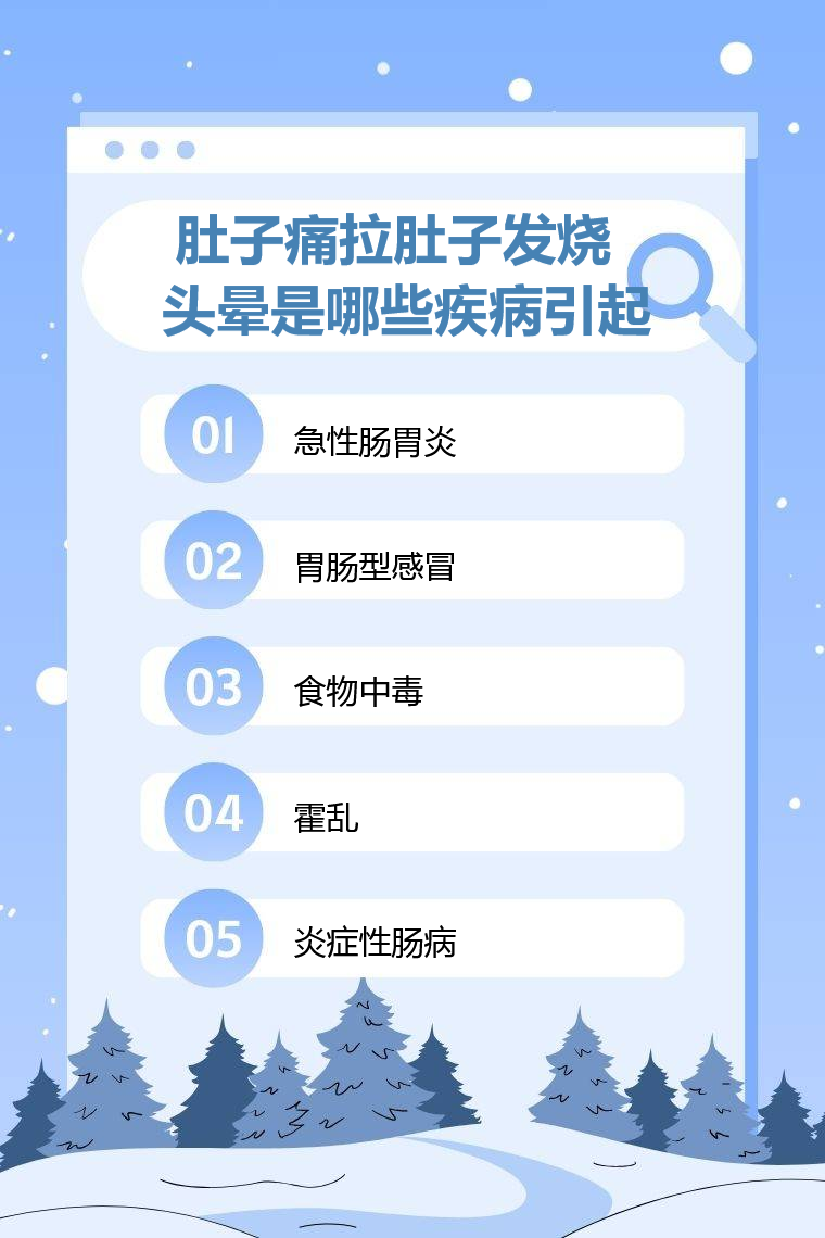 肚子痛拉肚子发烧头晕可能由急性肠胃炎、胃肠型感冒、食物中毒、霍乱、炎症性肠病等引起。