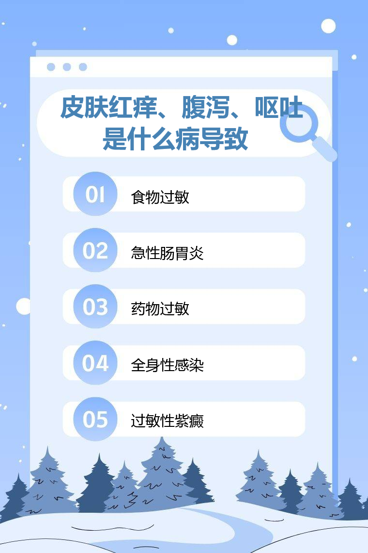 皮肤红痒、腹泻、呕吐可能由食物过敏、急性肠胃炎、药物过敏、全身性感染、过敏性紫癜等情况导致。