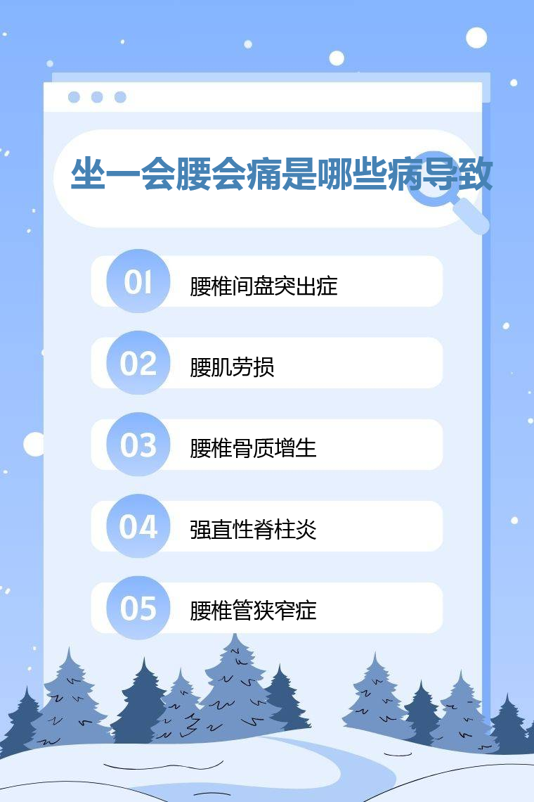 坐一会腰会痛可能由腰椎间盘突出症、腰肌劳损、腰椎骨质增生、强直性脊柱炎、腰椎管狭窄症等导致。