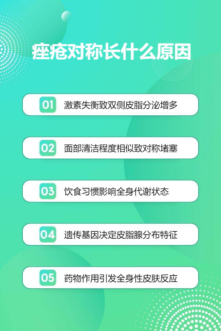 1. 内分泌失调:体内激素水平失衡是痤疮对称出现的常见原因。雄激素分泌增加,会促使皮脂腺分泌更多油脂,导致毛囊口堵塞,进而引发痤疮。青春期时,身体激素变化剧烈,皮脂腺功能活跃,容易出现对称分布的痤疮。女性在生理期、孕期等特殊时期,激素水平波动,也可能出现痤疮对称生长的情况。