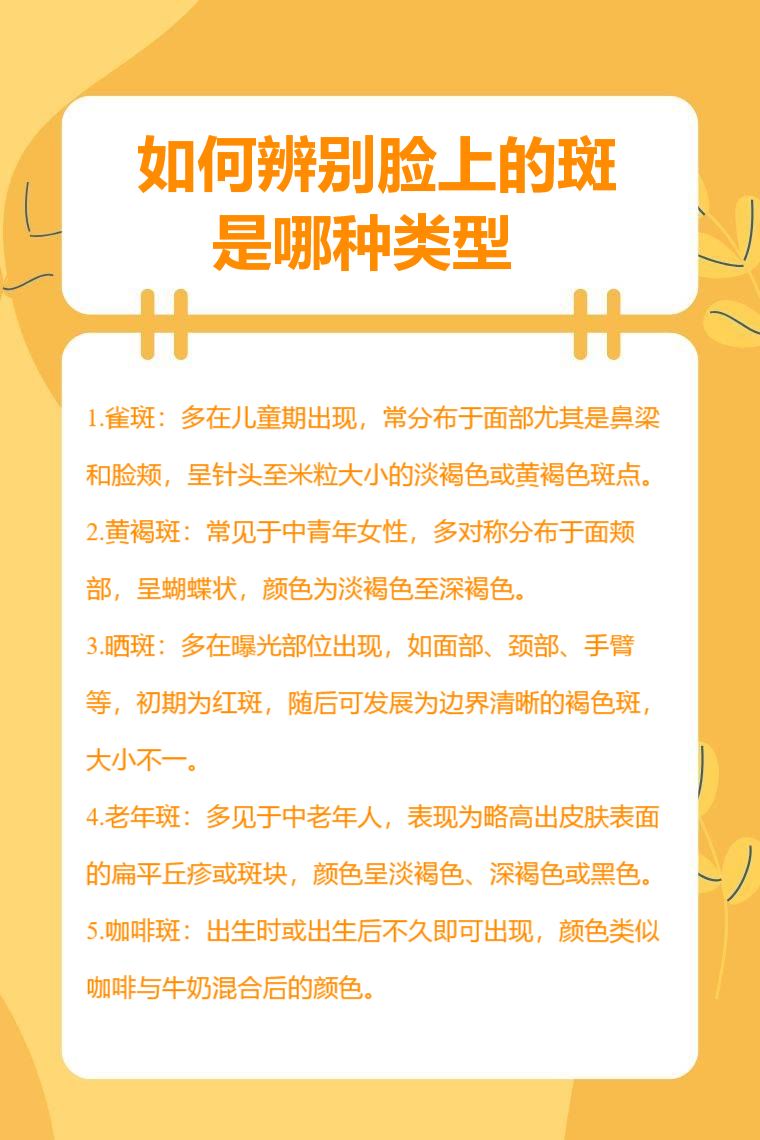 脸上的斑常见类型有雀斑、黄褐斑、晒斑、老年斑、咖啡斑等。