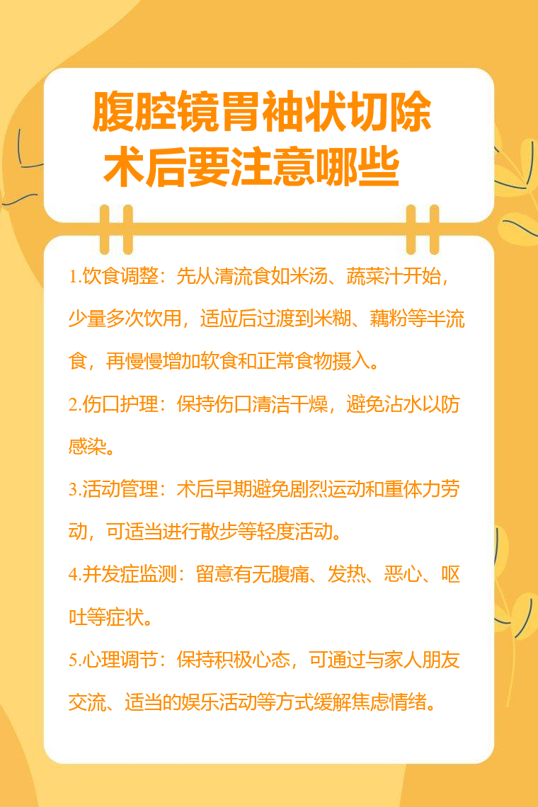 腹腔镜胃袖状切除术后患者要注意饮食调整、伤口护理、活动管理、并发症监测、心理调节等。