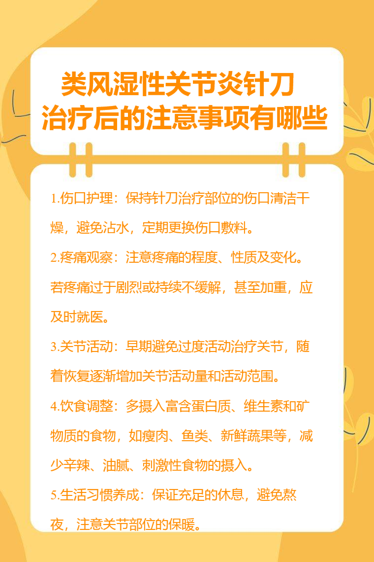 类风湿性关节炎针刀治疗后的注意事项包括伤口护理、疼痛观察、关节活动、饮食调整、生活习惯养成等。