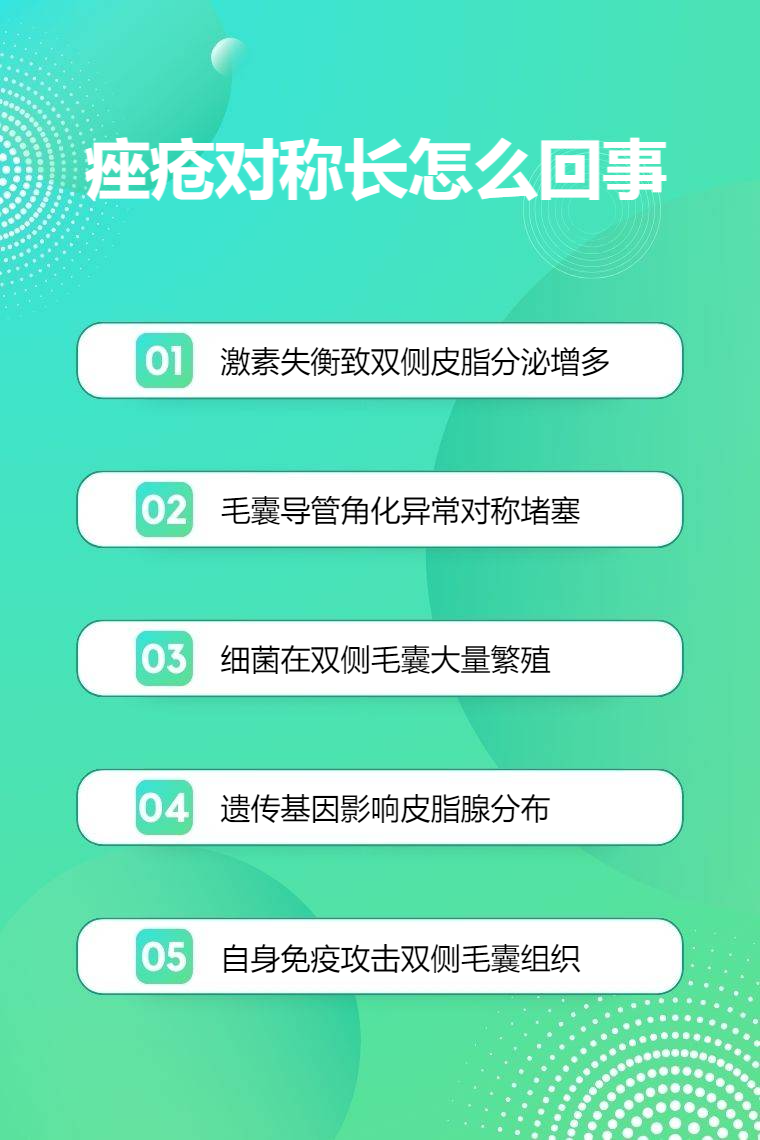 1. 内分泌失调:体内激素水平失衡,雄激素分泌增加,会促使皮脂腺分泌更多油脂,导致毛囊堵塞,进而引发痤疮。青春期雄激素水平上升,皮脂腺功能旺盛,痤疮容易对称出现。女性在月经周期、孕期等特殊时期,激素波动也可能导致痤疮对称发作。