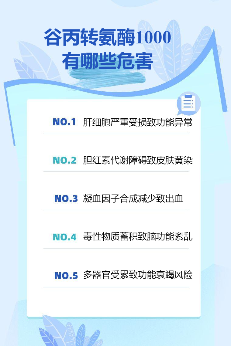 谷丙转氨酶1000可能带来肝功能损害、黄疸、凝血功能障碍、肝昏迷、多器官功能衰竭等危害。
