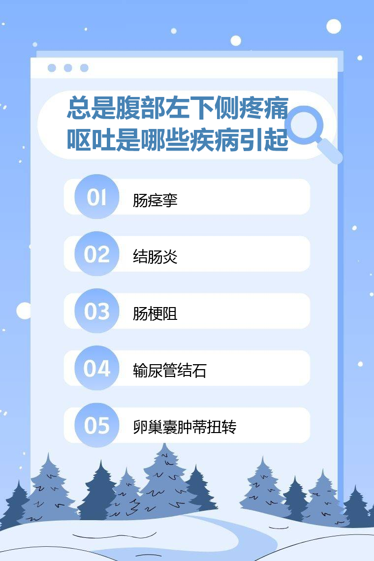 腹部左下侧疼痛呕吐可能由肠痉挛、结肠炎、肠梗阻、输尿管结石、卵巢囊肿蒂扭转等疾病引起。