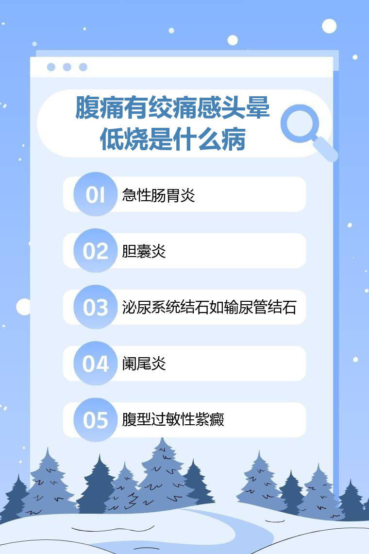 腹痛有绞痛感、头晕、低烧可能是急性肠胃炎、胆囊炎、泌尿系统结石、阑尾炎、腹型过敏性紫癜等。