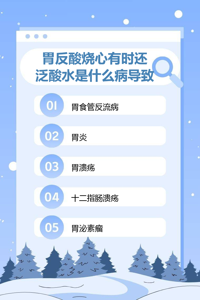 胃反酸烧心有时还泛酸水可能由胃食管反流病、胃炎、胃溃疡、十二指肠溃疡、胃泌素瘤等导致。