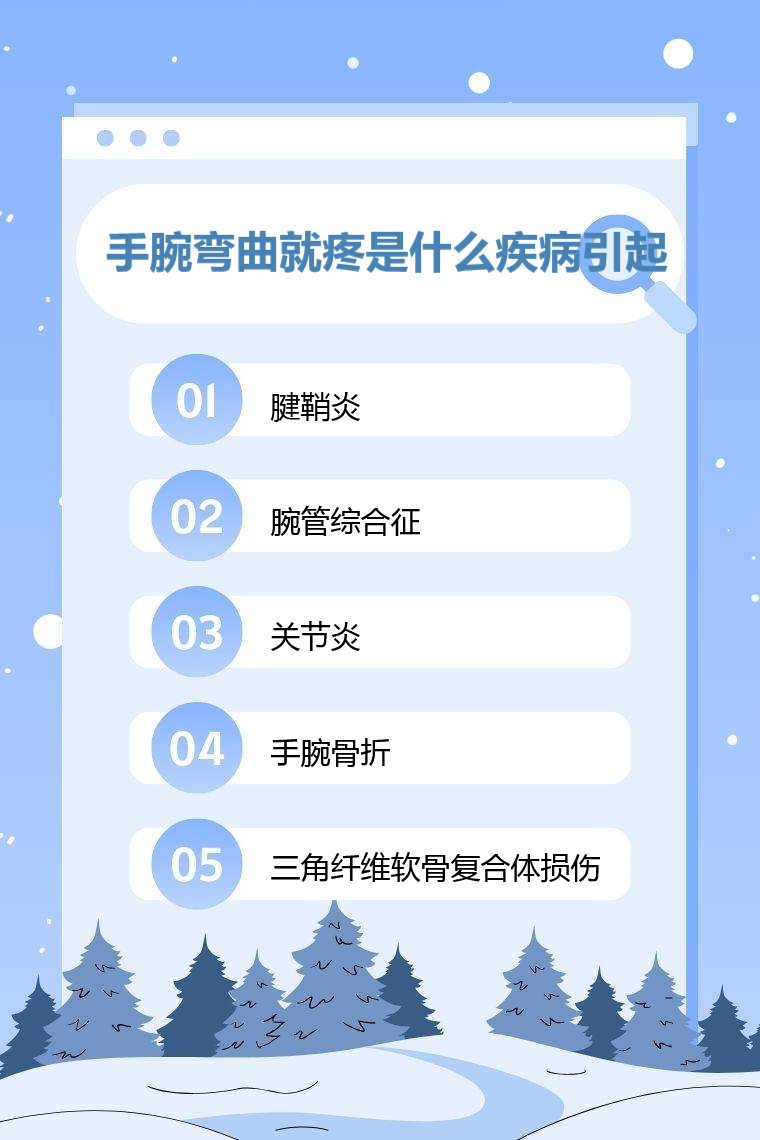手腕弯曲就疼可能由腱鞘炎、腕管综合征、关节炎、手腕骨折、三角纤维软骨复合体损伤等引起。