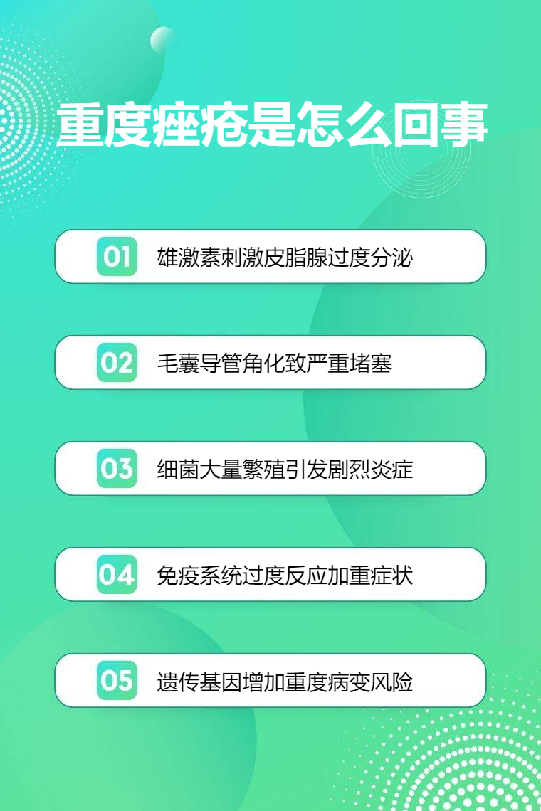 重度痤疮通常由内分泌失调、毛囊皮脂腺导管角化异常、微生物感染、炎症反应、遗传因素等引起。