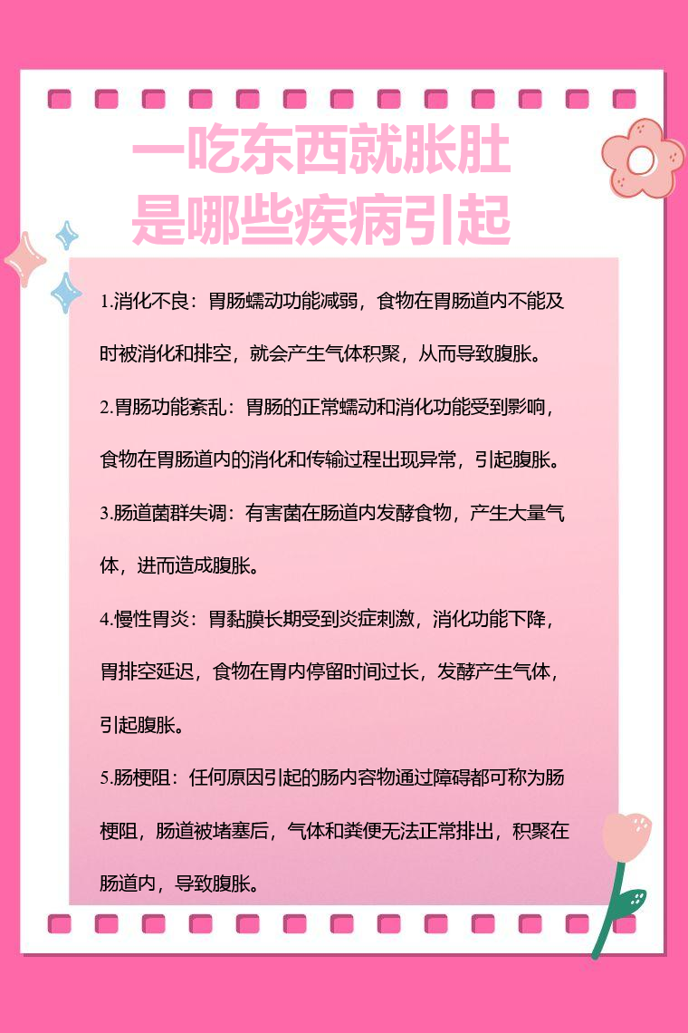 一吃东西就胀肚可能由消化不良、胃肠功能紊乱、肠道菌群失调、慢性胃炎、肠梗阻等疾病引起。