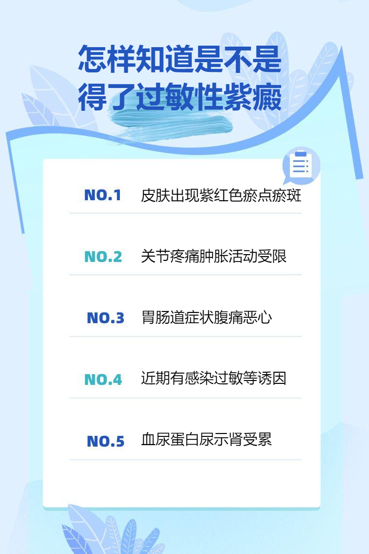 2. 病史情况:了解近期是否有上呼吸道感染、食用特殊食物、接触过敏原等诱发因素,若存在相关情况且出现上述症状,患过敏性紫癜可能性增加。