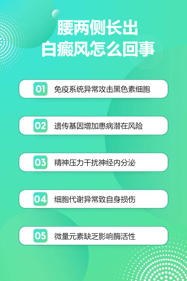 腰两侧长出白癜风可能与自身免疫因素、遗传因素、精神因素、黑色素细胞自毁、微量元素缺乏等有关。