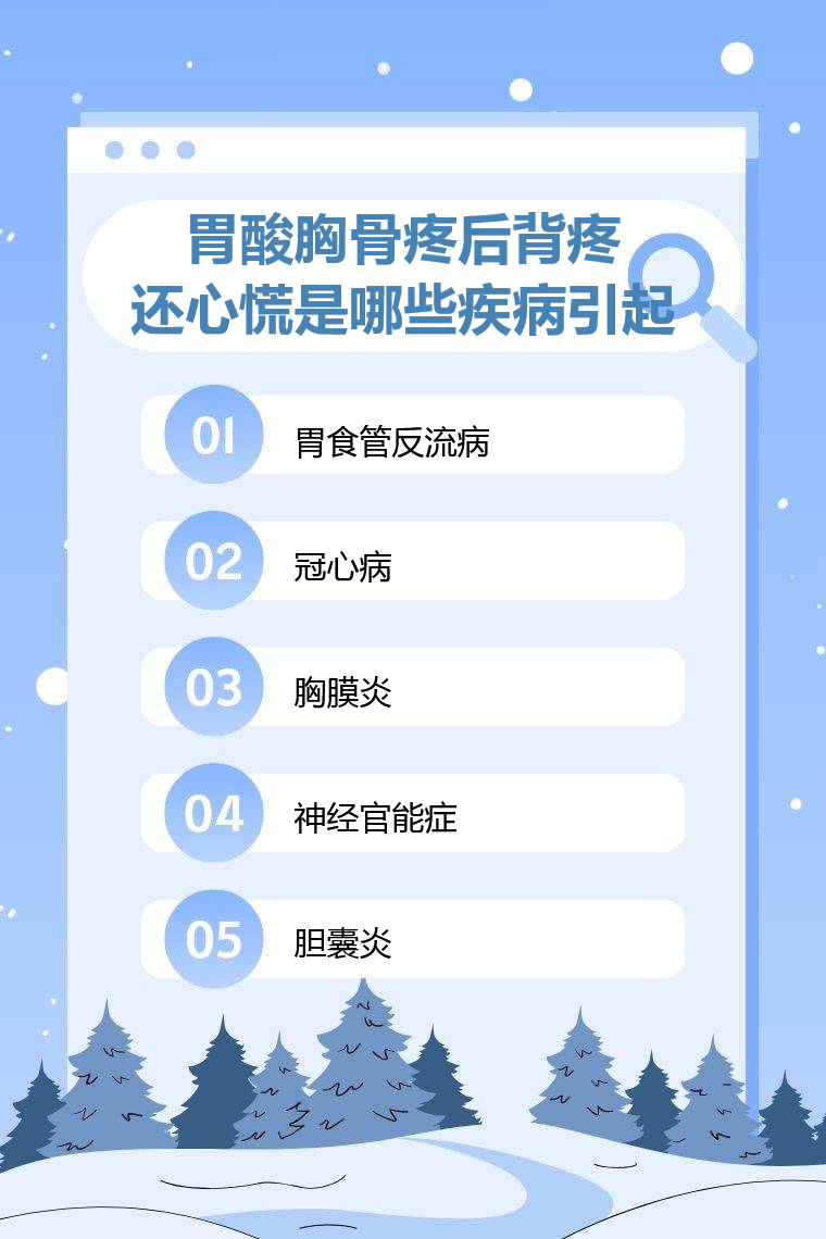 胃酸、胸骨疼、后背疼还心慌可能由胃食管反流病、冠心病、胸膜炎、神经官能症、胆囊炎等疾病引起。