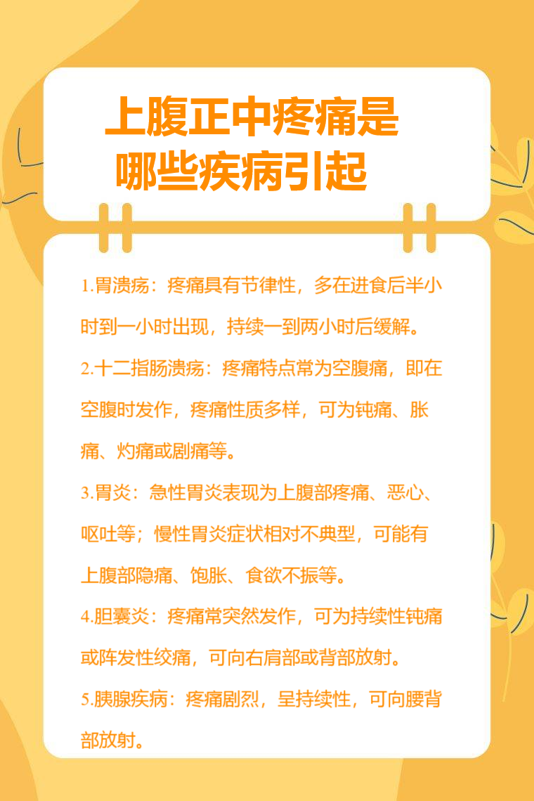 上腹正中疼痛可能由胃溃疡、十二指肠溃疡、胃炎、胆囊炎、胰腺疾病等引起。