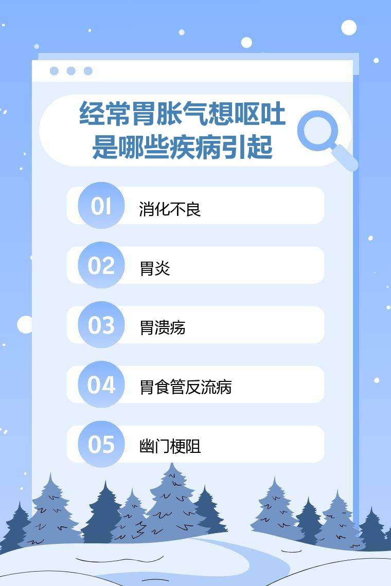 经常胃胀气想呕吐可能由消化不良、胃炎、胃溃疡、胃食管反流病、幽门梗阻等疾病引起。