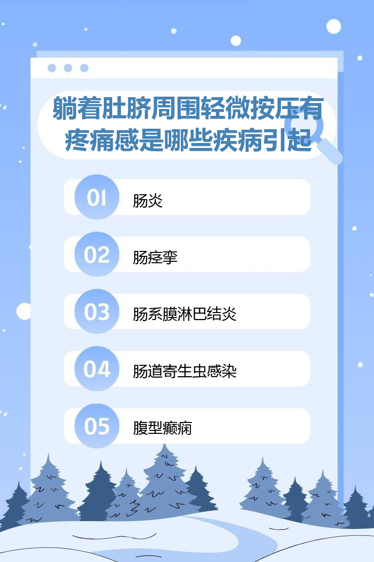 躺着肚脐周围轻微按压有疼痛感可能由肠炎、肠痉挛、肠系膜淋巴结炎、肠道寄生虫感染、腹型癫痫等疾病引起。
