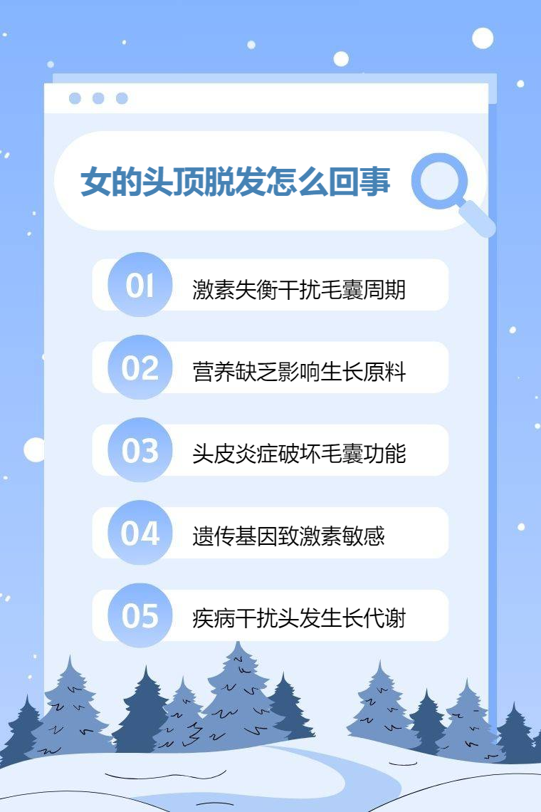 4. 遗传因素:遗传在女性头顶脱发中也起着重要作用。如果家族中有脱发的遗传史,遗传基因可能会使女性头顶的毛囊对雄激素更为敏感,在雄激素的作用下,毛囊逐渐萎缩,头发逐渐变细变软,最终脱落。这种脱发通常具有渐进性的特点。