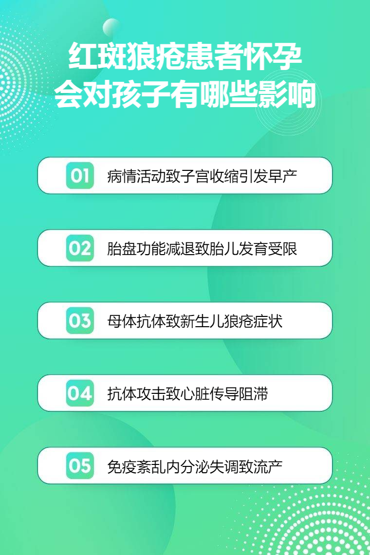 红斑狼疮患者怀孕可能对孩子产生早产、胎儿生长受限、新生儿狼疮综合征、先天性心脏传导阻滞、流产等影响。