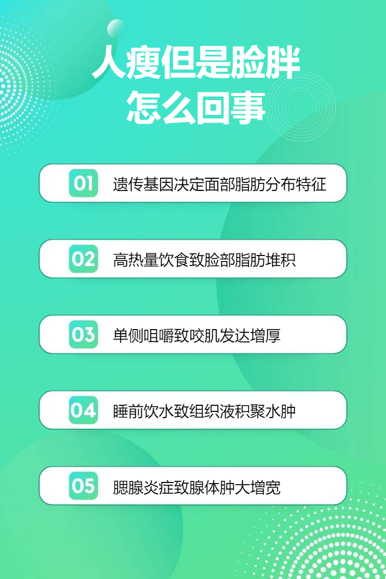 5. 腮腺肥大:腮腺炎症等因素可致腮腺肥大,使脸看起来胖。需及时就医,在医生指导下进行抗炎等针对性治疗。