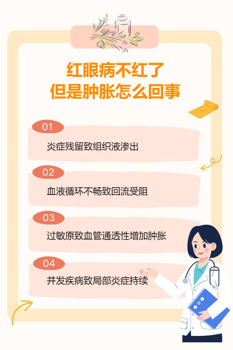 红眼病不红了但肿胀可能是炎症未完全消退、局部血液循环不畅、过敏反应、并发其他眼部疾病等情况。