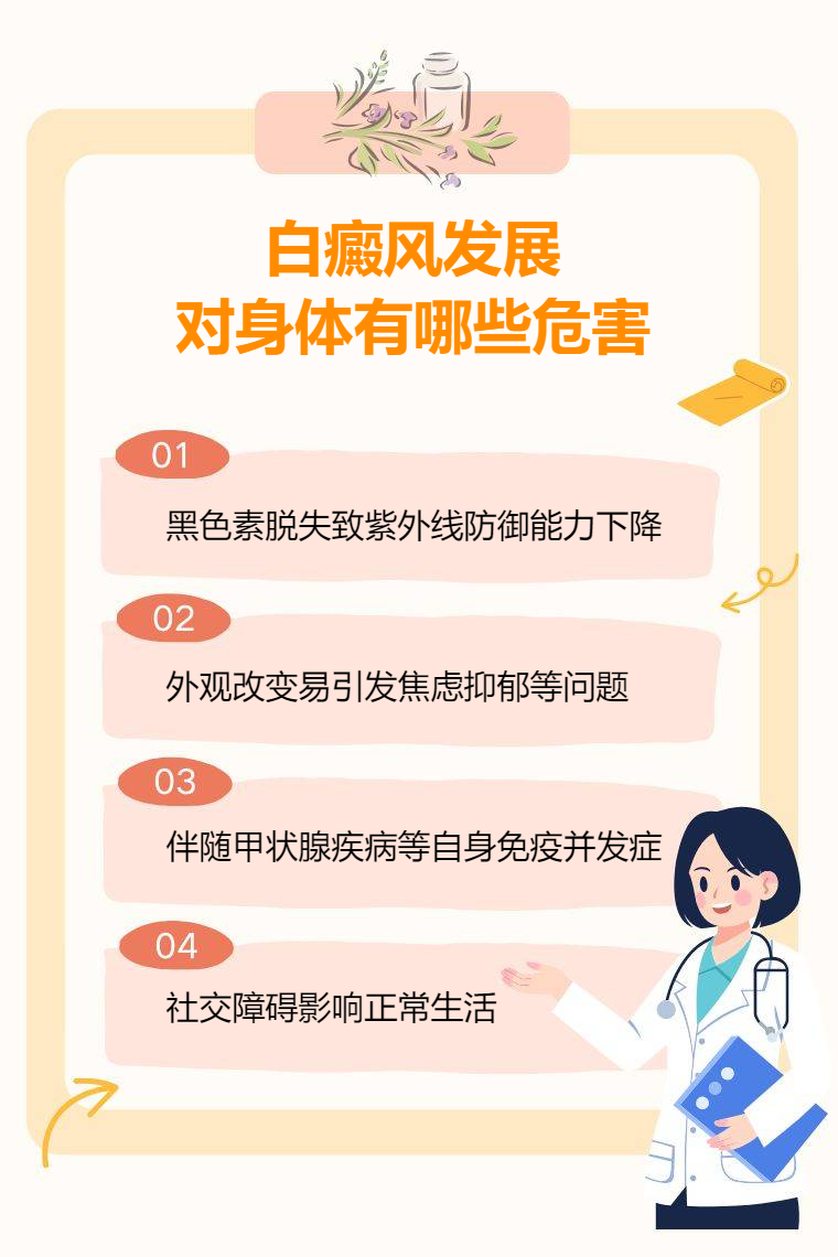 白癜风发展对身体的危害包括皮肤损伤、心理影响、引发并发症、影响生活质量等。