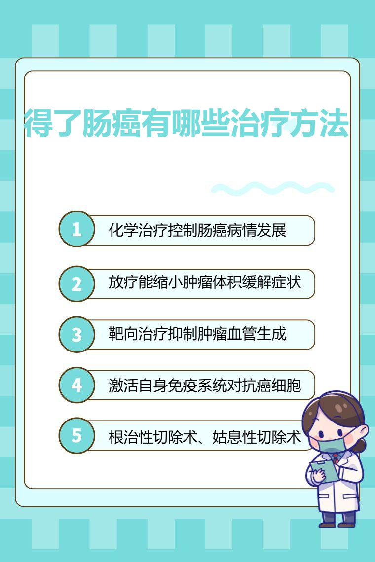 得了肠癌常见的治疗方法有化学治疗、放射治疗、靶向治疗、免疫治疗、手术治疗等。