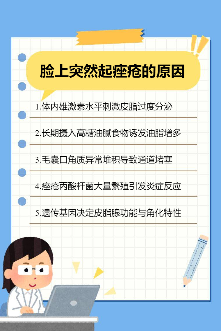 脸上突然起痤疮的原因有内分泌失调、皮脂腺分泌旺盛、毛囊皮脂腺导管角化异常、微生物感染、遗传因素等。