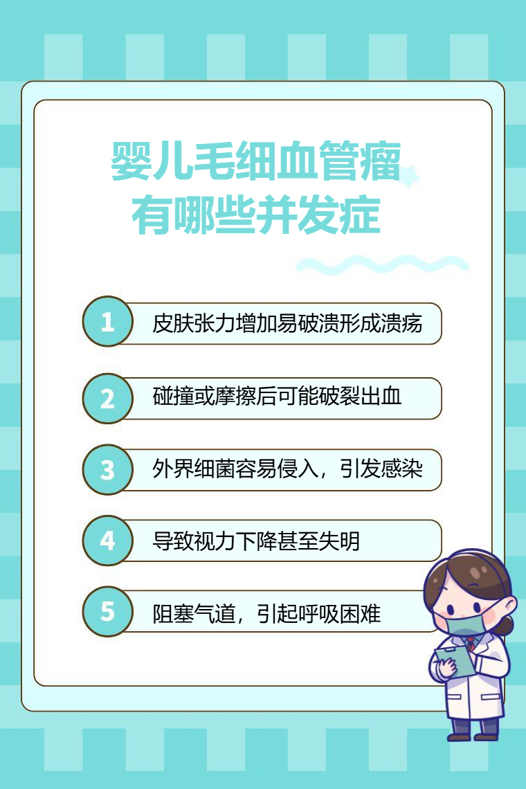 婴儿毛细血管瘤的并发症有溃疡、出血、感染、视力障碍、呼吸困难等。