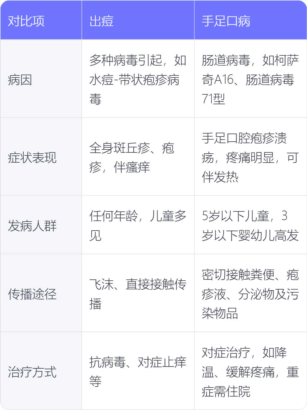 出痘和手足口病在病因、症状表现、发病人群、传播途径、治疗方式上存在不同。