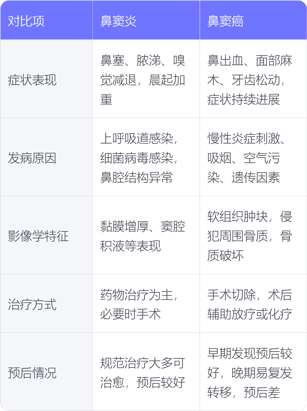 鼻窦炎和鼻窦癌可从症状表现、发病原因、影像学特征、治疗方式、预后情况来区分。