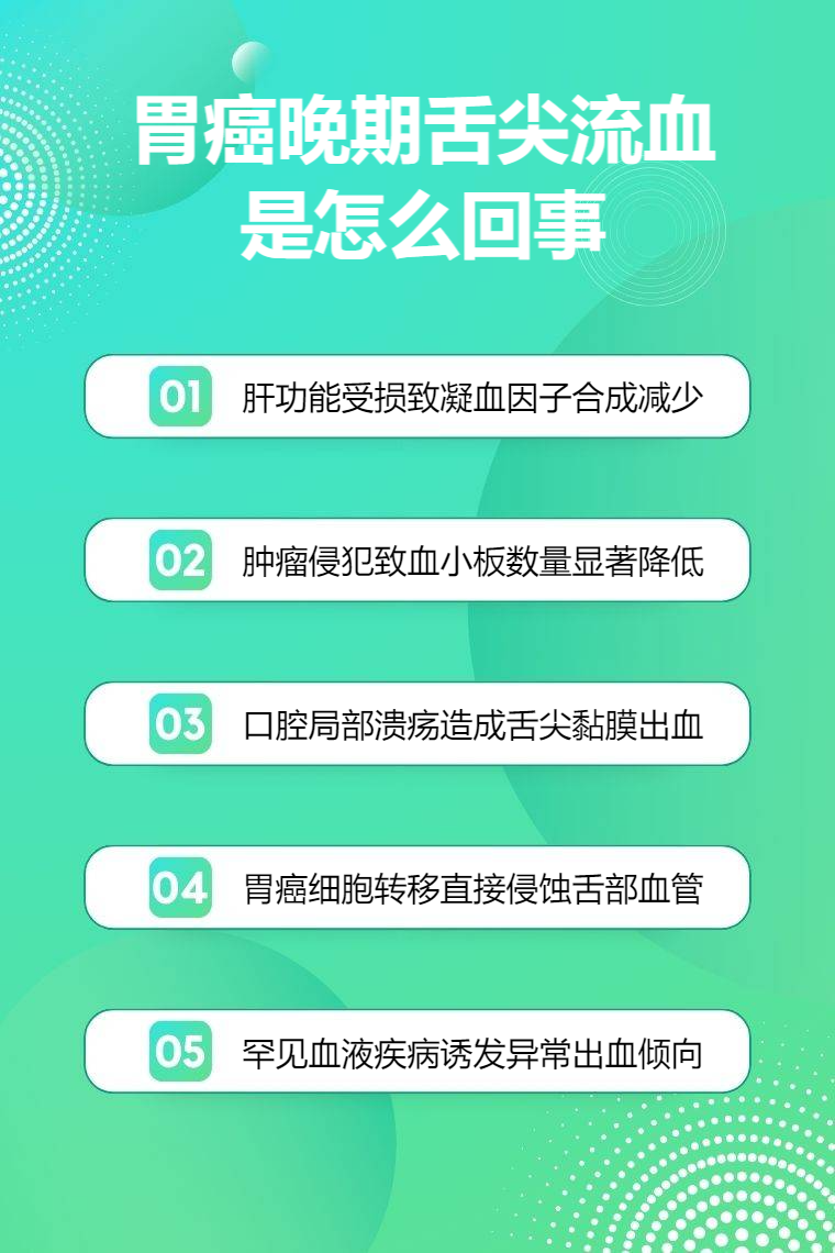 4. 肿瘤转移:虽然相对少见,但胃癌晚期肿瘤可能转移至口腔部位,侵犯舌尖的血管和组织,破坏其正常结构,导致血管破裂出血。这种转移可能通过血液循环或淋巴系统到达口腔。