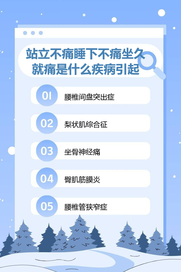 站立不痛睡下不痛坐久就痛可能由腰椎间盘突出症、梨状肌综合征、坐骨神经痛、臀肌筋膜炎、腰椎管狭窄症等疾病引起。