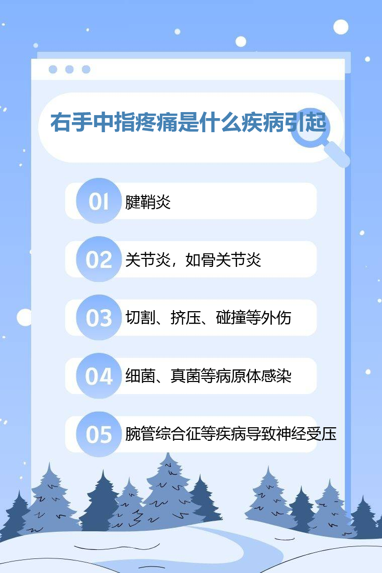 右手中指疼痛可能由腱鞘炎、关节炎、外伤、感染、神经受压等引起。