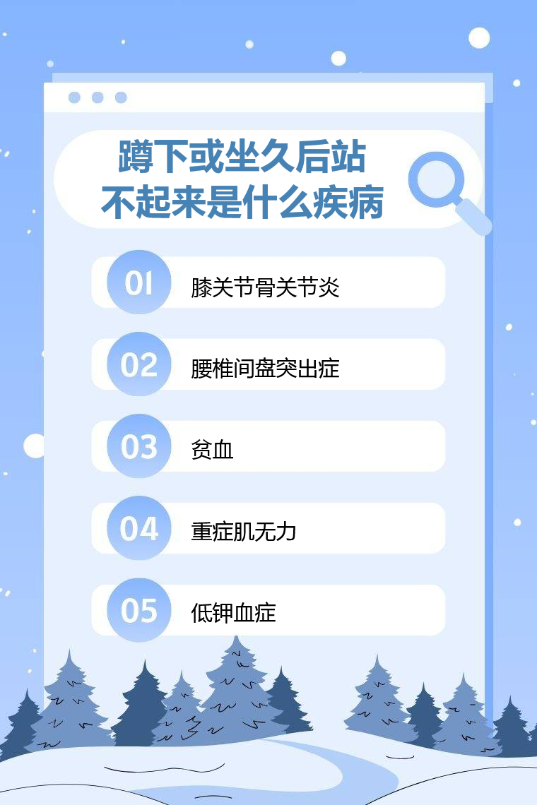 蹲下或坐久后站不起来可能是由多种疾病导致,如膝关节骨关节炎、腰椎间盘突出症、贫血、重症肌无力、低钾血症等。