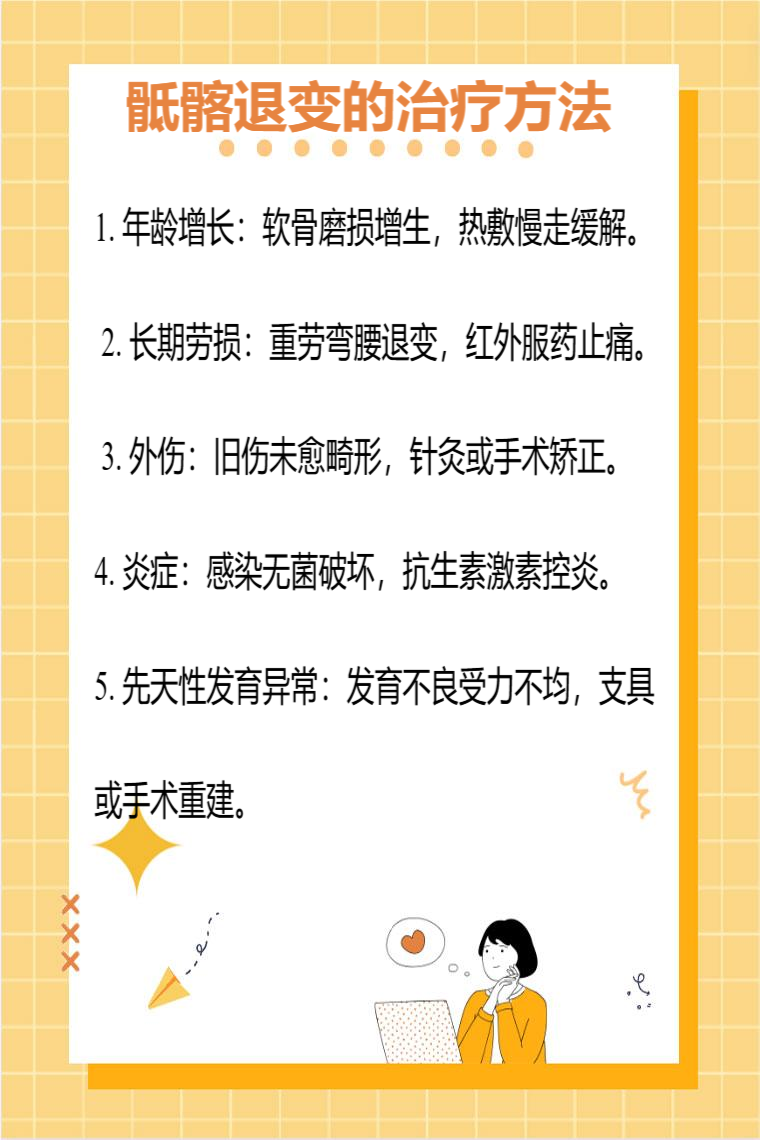 骶髂退变可能是年龄增长、长期劳损、外伤、炎症、先天性发育异常等因素,需要针对病因治疗,可采取的方法有物理治疗、药物治疗、手术治疗等。