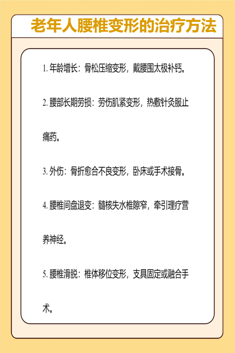 老年人腰椎变形可能是年龄增长、腰部长期劳损、外伤、腰椎间盘退变、腰椎滑脱等因素,需要针对病因治疗,可采取的方法有保守治疗、手术治疗等。