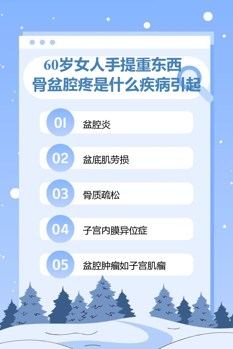 1.盆腔炎:60岁女性身体抵抗力下降,若不注意个人卫生等,易引发盆腔炎症。手提重物时,腹部压力增加,炎症部位受到刺激,引发骨盆腔疼痛,常伴有发热、白带异常等症状。