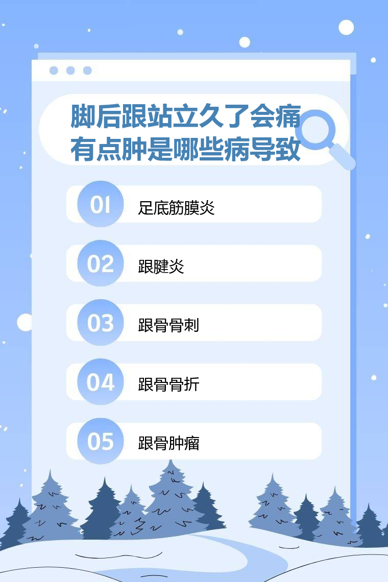 脚后跟站立久了会痛且有点肿可能由足底筋膜炎、跟腱炎、跟骨骨刺、跟骨骨折、跟骨肿瘤等导致。