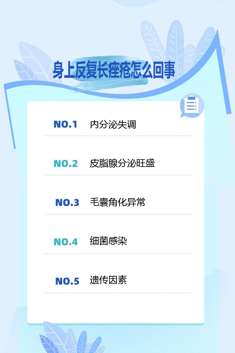 身上反复长痤疮通常与内分泌失调、皮脂腺分泌旺盛、毛囊角化异常、细菌感染、遗传因素等有关。